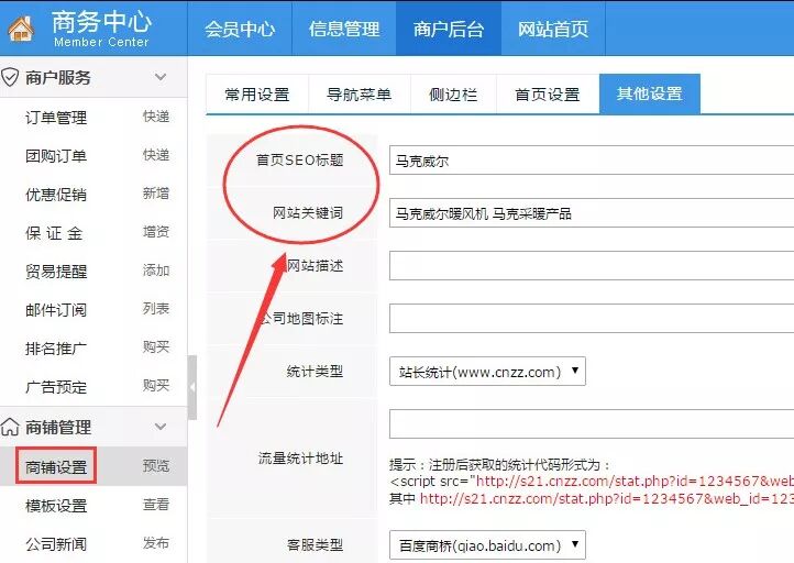 在商务中心 - 商户后台 - 商铺设置里,可以设置首页SEO标题、网站关键词等等,进行优化。