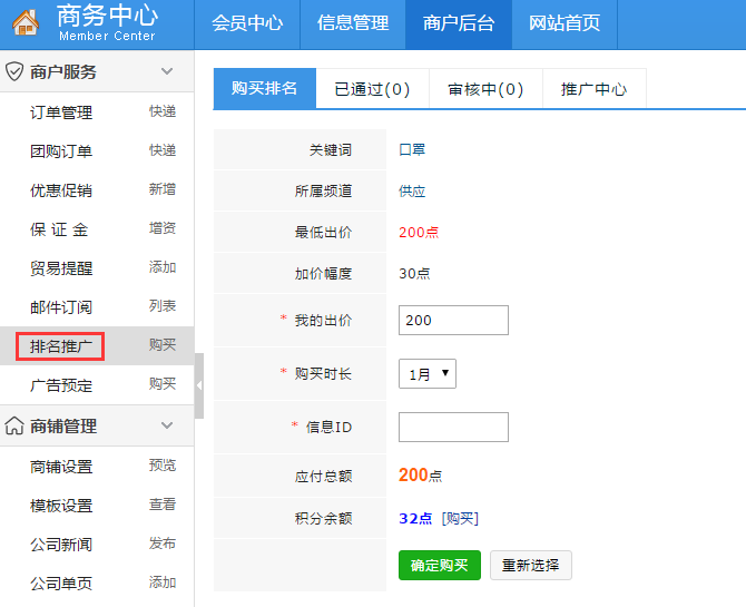 购买排名将消耗会员账号里的积分,而积分的获取,除了充值以外,完善资料、商铺装修、发布文章等一些操作都可以获得积分。
