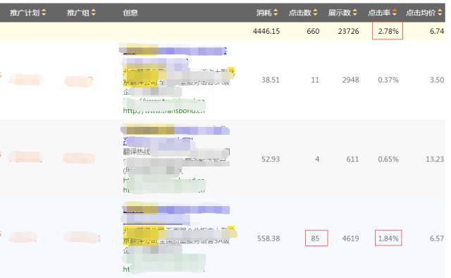 如下图中,创意的平均点击率是2.78%,对于第三条创意,点击85次,点击率1.84%,远低于平均点击率,这条创意就要重点优化。