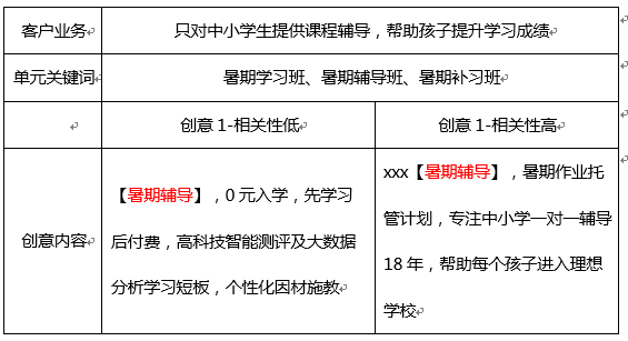 一、如何判断一个创意好不好? 判断账户中哪些创意“好”,哪些创意“不好”。可以用到两个后台的工具。 工具一 有展现无点击报告 分计算机和移动两种维度,查看账户中有展现无点击关键词,进行针对性的进行优化。 入口:搜索推广>数据报告>关键词报告>有展现无点击报告 使用方法: 通过平均排名进行筛选,对于平均排名≤3的关键词,说明广告排在前面但依然不会被网民点击,这类关键词需要先优化对应的创意。 工具二 创意报告 被很多人“忽略”的创意报告,恰恰是鉴别创意好坏的基础报告。 入口:搜索推广>数据报告>创意报告 使用方法 选取一段时间内(建议7天)的创意报告,按点击率倒序排列,对于小于平均点击率,且点击量较多的创意,需要优先优化。 如下图中,创意的平均点击率是2.78%,对于第三条创意,点击85次,点击率1.84%,这条创意就要重点优化。 二、如何写好创意 1、完整 “好”创意的标题,一定要是完整的一句话。 网民对创意的最初印象往往来自标题。标题如有截断,可能影响到用户阅读体验。 下图是主流机型的标题限制字数,供您参考,避免标题截断。小编建议,创意标题的前14个字,一定是完整的一段话。 2、相关 “好”创意一定要与网民的需求强相关! 例如,做暑期托管班的客户,如只宣传辅导班的优势,未提示只针对“中小学生”人群,这样会带来大量误点击(如创意1)。若注明“专注中小学一对一辅导18年”,可有效排除大学生,研究生等群体(如创意2)。 3、省事 “好”创意要让网民更快的获得信息,更省事。 一条“好”创意,就是让网民更加省事的获取到相关信息。同时,也为企业主缩短转化路径,提升咨询量。搜狗无线端的QQ咨询、咨询电话和APP下载,大大缩短网民获取信息的路径。 拨打电话:超过20%的网民习惯直接拨打电话咨询 QQ咨询:超过30%的网民习惯直接点击QQ交谈 APP下载强样式:超过50%的网民选择直接下载APP 4、新颖 活用各种创意样式,让您的广告脱颖而出! 搜狗为广大推广用户提供了多种丰富的样式。您可以根据自己的推广需求,选择添加。 添加入口:搜索推广>推广管理>附加创意 如下图所示,更加新颖的样式可以获得更高的点击率。下图中图景样式的点击率提升80%以上。 注:无线图景现针对部分招商行业客户开放。 工具三 批量编辑附件创意工具 针对QQ咨询、电话咨询两种附加样式,旭日后台可以实现全部物料批量编辑。 1、用户进入QQ咨询或咨询电话列表,勾选“选中全部”按钮即可选中当前列表的全部物料; 2、选中后,可批量进行“修改”、“启用”、“暂停”、“删除”等操作;